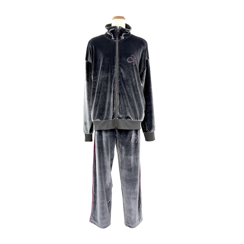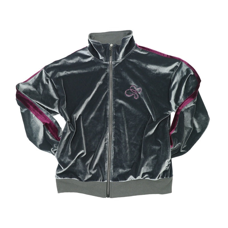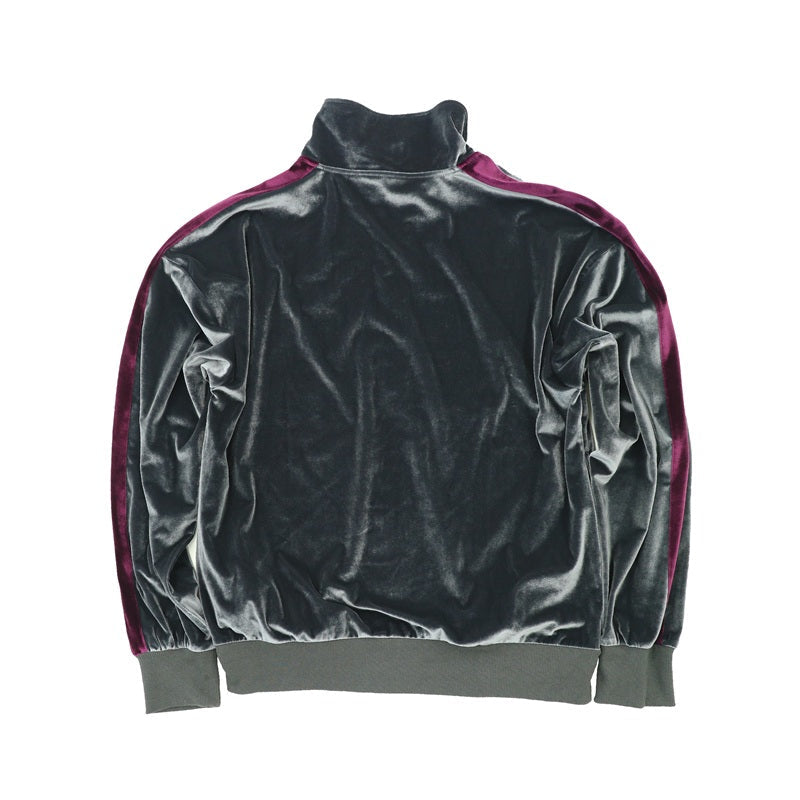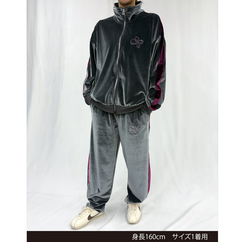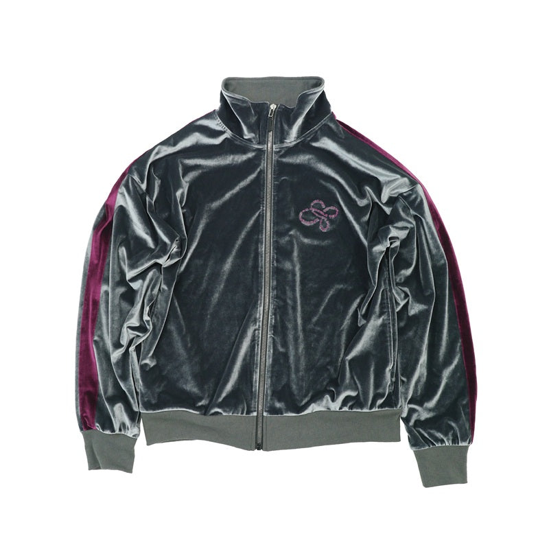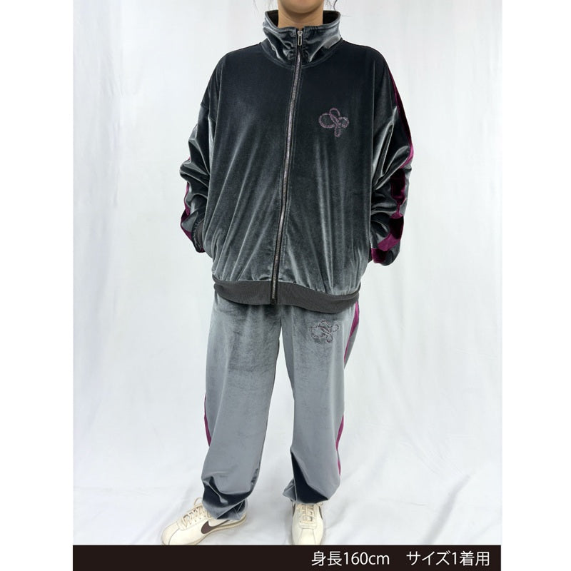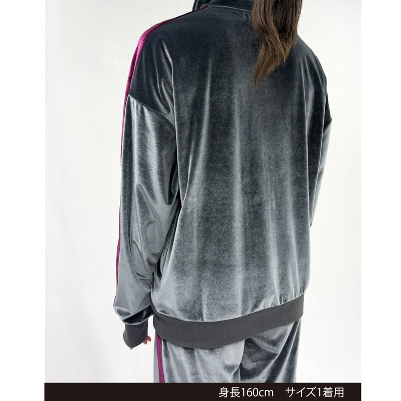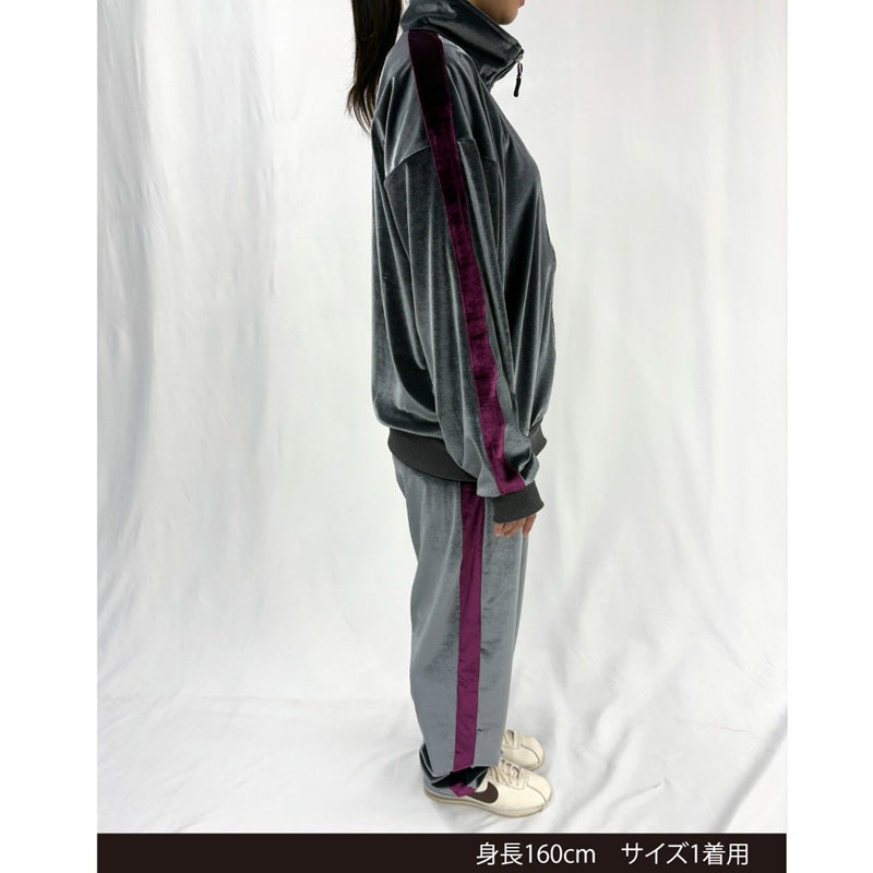 上品な光沢のシルバーグレーにパープルラインを配したベロアジャージ。ルーズなシルエットでリラックス感を演出。パンツと合わせてセットアップとして着こなせる。
