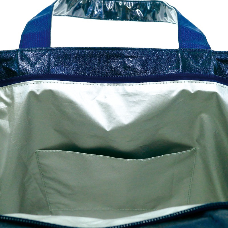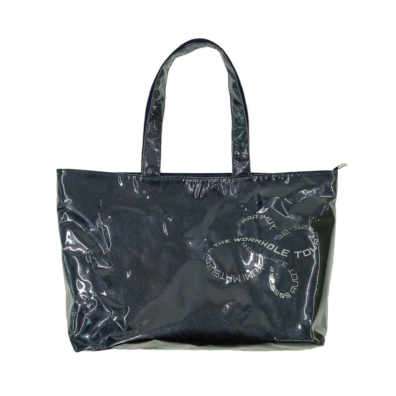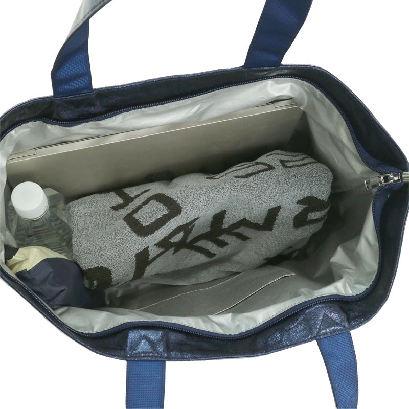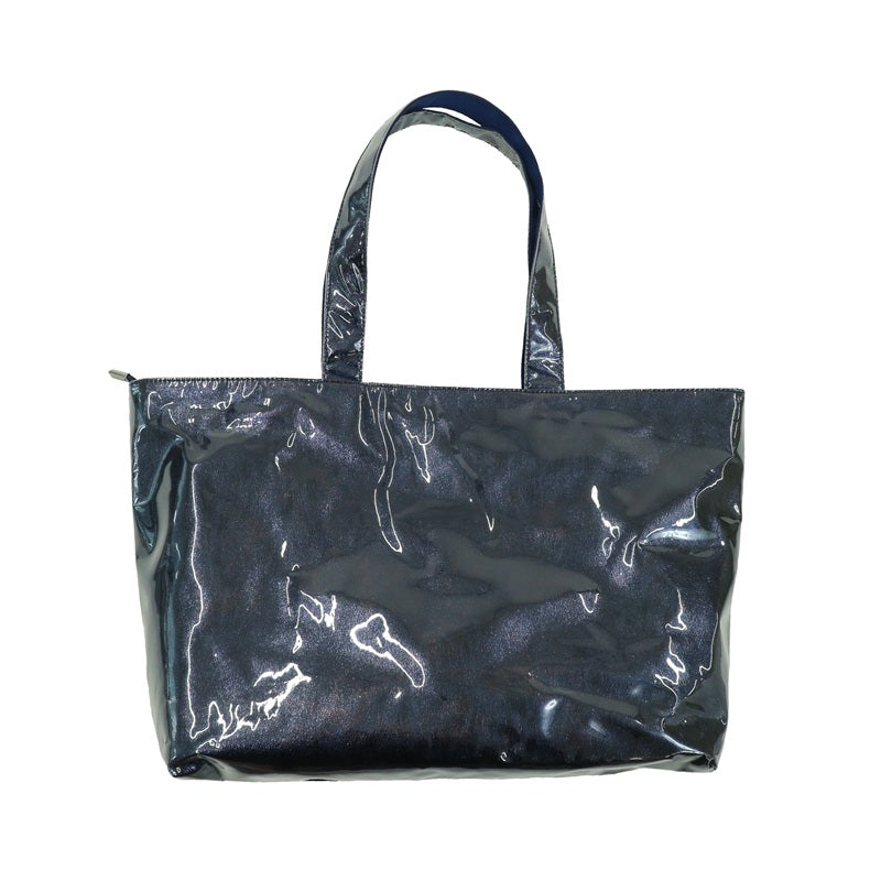 透明のオーバー層とネイビーブルーのインナー層を重ねたトート。底マチ付きで荷物がしっかり入るため、デイリーユースに最適。光沢感がさりげなく上品な印象を演出。